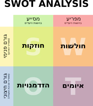 מודל ה-SWOT מעברית שמאל למעלה עם כיוון השעון: חוזקות, חולשות, איומים והזדמנויות