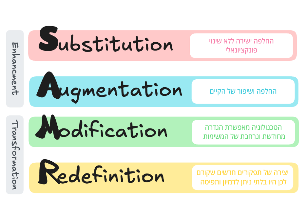אחת המסגרות הפשוטות והמוצלחות לדיון בפיתוח והטמעת טכנולוגיות חדשות היא זו של מודל SAMR. המודל נוצר בכלל בעולמות הפדגוגיה, אבל אנחנו מוצאים אותו רלוונטי מאוד גם לעולמות הדיגיטציה והבינה המלאכותית בהיבטים רחבים יותר. המודל חותר תחת הפנטזיה לפיה טכנולוגיה החדשה משנה את העולם בין-רגע. בפועל התבוננות על מהפכות בסדר גודל דומה (למשל האינטרנט, הסמארטפונים וכיוב׳) מראה שלוקח זמן רב – לעתים אפילו דורות ושנים עד להגעה של טכנולוגיה לבשלות, כלומר עד לביסוס תפיסה תרבותית רחבה של מה ניתן לעשות עם הטכנולוגיה ואיך ולהפיכת הטכנולוגיה למובן מאיליו שלנו.